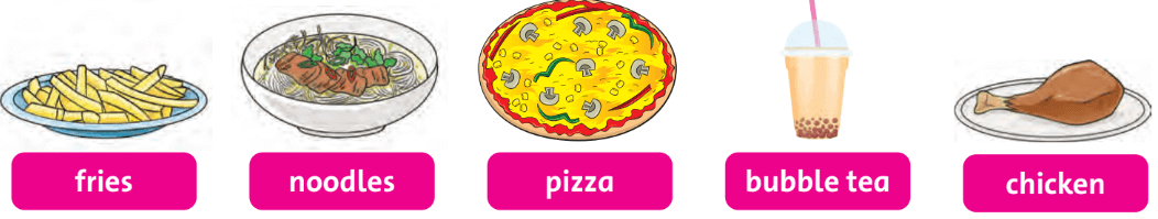 fries, noodles, pizza, bubble tea, chicken, pizza, fries, chicken, noodles, bubble tea