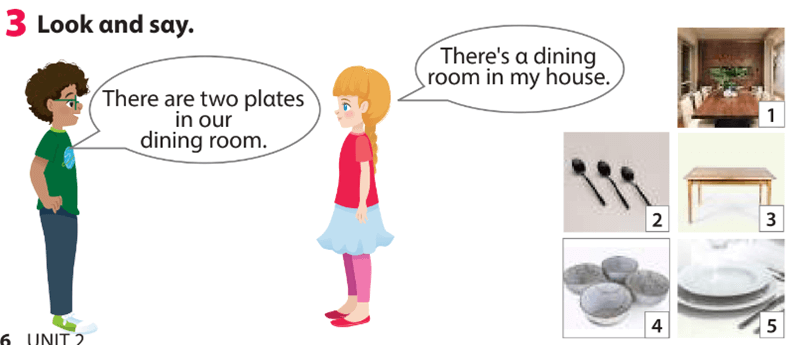Ann: Phòng ăn nhà bạn lớn. Có nhiều bát và đĩa trên bàn. Nhìn kìa! Đó là một cái thìa. Cái thìa là của ai?