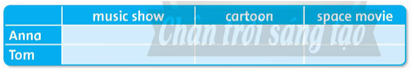 2 (trang 98 Tiếng Anh lớp 5 Family and Friends): Listen. Check (√) or cross (×) the programs that the children want to watch. (Nghe. Tick hoặc gạch chéo những chương trình mà bọn trẻ muốn xem.)