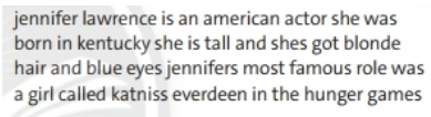 Jennifer Lawrence is an American actor. She was born in Kentucky. She is tall and she’s got blonde hair and blue eyes. Nhân vật nổi tiếng nhất của Jennifer là cô gái có tên là Katniss Everdeen trong bộ phim The Hunger Games.