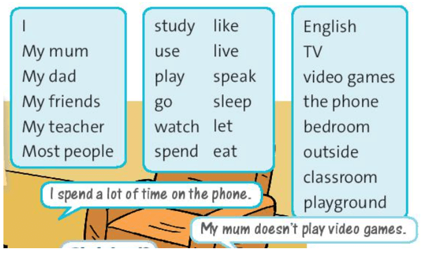Write true and false sentences using the words in the boxes. Use affirmative and negative forms. Compare with your partner. (Viết các câu đúng và sai bằng cách sử dụng các từ trong các ô trống. Sử dụng các hình thức khẳng định và phủ định. So sánh với bạn làm chung của bạn.)