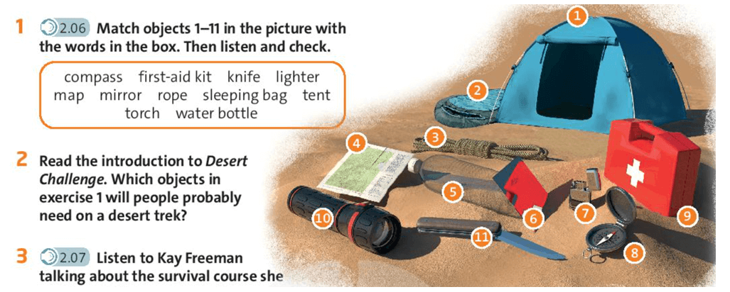 2 (trang 72 sgk Tiếng Anh 7 Friends plus): Read the introduction to Desert Challenge. Which objects in exercise 1 will people probably need on a desert trek? (Đọc phần giới thiệu về Thử thách sa mạc. Những đồ vật nào trong bài tập 1 có lẽ mọi người sẽ cần khi đi bộ trên sa mạc?)