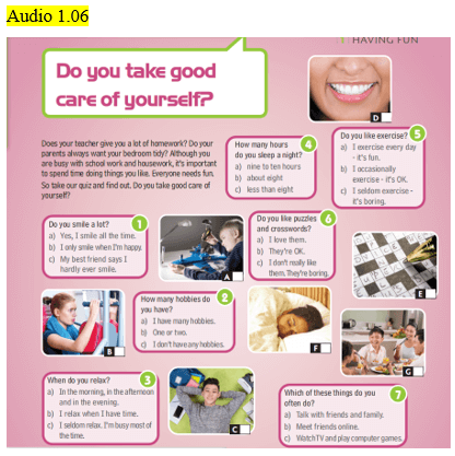 4 (trang 14 SGK Tiếng Anh 7 THiNK): Read and listen to the quiz on page 15. Match the pictures with the questions in the quiz. Write 1-7 in the boxes. (Đọc và nghe bộ câu hỏi ở trang 15. Nối tranh với những câu hỏi trong bộ câu hỏi. Điền 1-7 vào ô trống.)