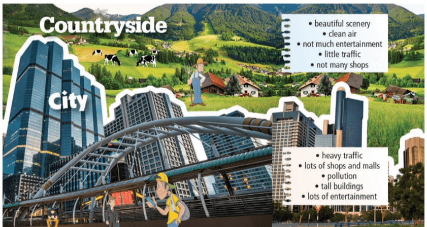 3 (trang 14 SGK tiếng Anh 8 Right-on) Do you like living in the city or in the countryside? Why? Tell your partner. (Bạn thích sống ở thành phố hay nông thôn? Tại sao? Nói với bạn cặp của bạn.)