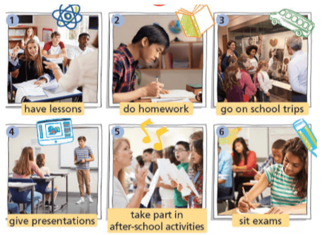 4 (trang 68 SGK tiếng Anh 8 Right-on) Use the phrases in Exercise 1 to describe your school life to your partner. (Sử dụng các cụm từ trong Bài tập 1 để mô tả cuộc sống học đường của em cho bạn cặp của em.)