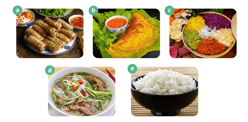 5 (trang 46 sgk Tiếng Anh 9 Global Success): Work in groups. Match the Vietnamese dishes with their names in English (Làm việc nhóm. Nối các món ăn Việt Nam với tên của chúng bằng tiếng Anh)
