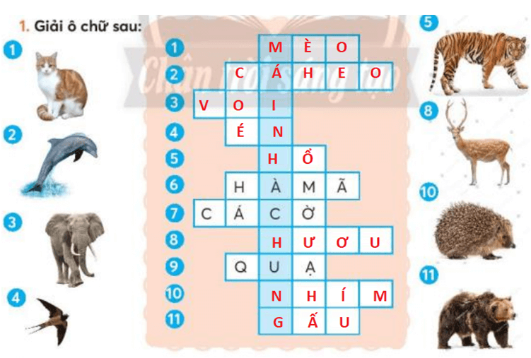 Câu 2 trang 115 sgk Tiếng Việt lớp 3: Nói 1-2 câu về một con vật có trong ô chữ vừa hoàn thành.