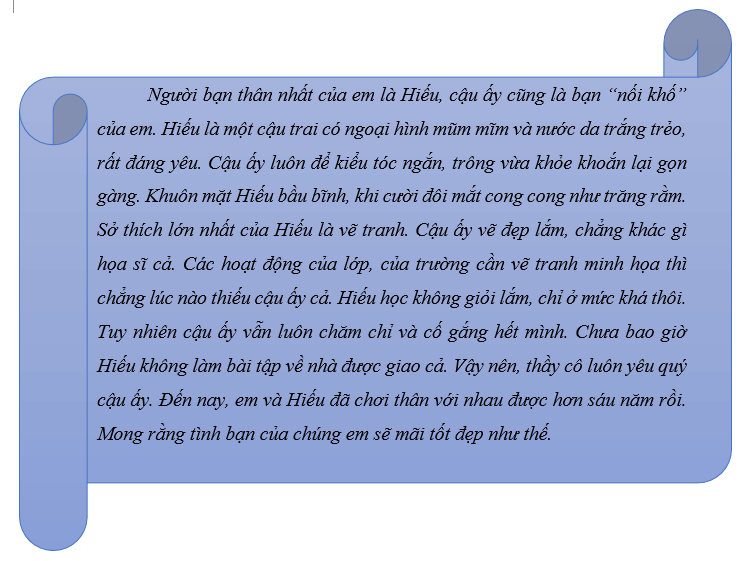 Người bạn thân nhất của em là Hiếu, cậu ấy cũng là bạn “nối khố” của em. Hiếu là một cậu trai có ngoại hình mũm mĩm và nước da trắng trẻo, rất đáng yêu. Cậu ấy luôn để kiểu tóc ngắn, trông vừa khỏe khoắn lại gọn gàng. Khuôn mặt Hiếu bầu bĩnh, khi cười đôi mắt cong cong như trăng rằm. Sở thích lớn nhất của Hiếu là vẽ tranh. Cậu ấy vẽ đẹp lắm, chẳng khác gì họa sĩ cả. Các hoạt động của lớp, của trường cần vẽ tranh minh họa thì chẳng lúc nào thiếu cậu ấy cả. Hiếu học không giỏi lắm, chỉ ở mức khá thôi. Tuy nhiên cậu ấy vẫn luôn chăm chỉ và cố gắng hết mình. Chưa bao giờ Hiếu không làm bài tập về nhà được giao cả. Vậy nên, thầy cô luôn yêu quý cậu ấy. Đến nay, em và Hiếu đã chơi thân với nhau được hơn sáu năm rồi. Mong rằng tình bạn của chúng em sẽ mãi tốt đẹp như thế.