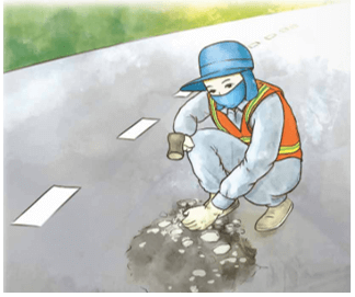 - Tay trái bác xếp rất khéo léo những viên đá bọc nhựa đường đen nhánh vào chỗ trũng.