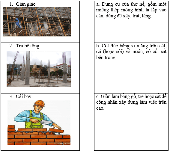 A. Giàn giáo, trụ bê tông, cái bay, vôi, gạch, vữa.