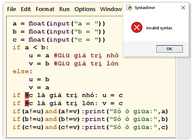 Ba bạn Bình, An, Phúc thảo luận với nhau để viết chương trình Python nhập vào từ bàn phím ba số thực khác nhau và in ra màn hình số đứng giữa trong ba số (số đó không là lớn nhất và cũng không là nhỏ nhất).