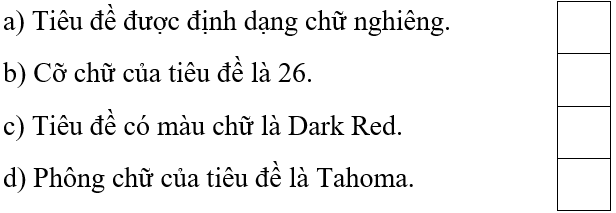 Câu 8. Cho hình ảnh kết quả tiêu đề văn bản sau khi được định dạng như sau: