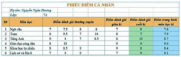 Nhiệm vụ: Em hãy dùng phần mềm bảng tính tạo một phiếu điểm cá nhân theo mẫu ở Hình 1.