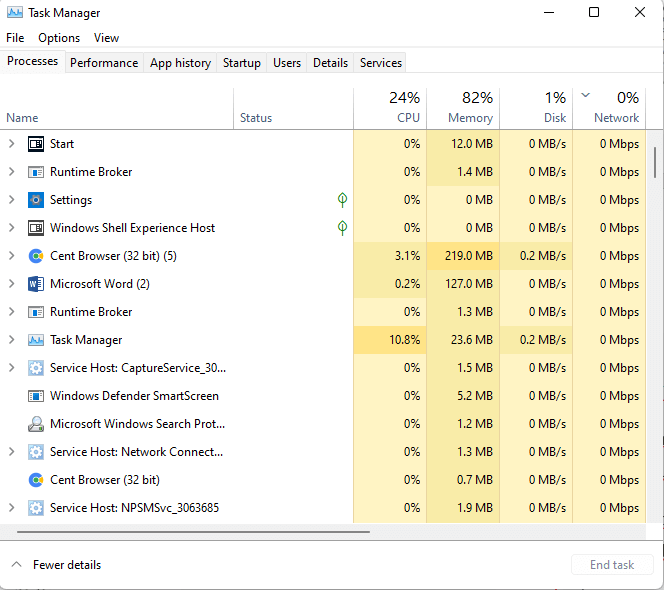 Hình 3. Cửa sổ quản lí tiến trình của hệ điều hành (Task Manager).