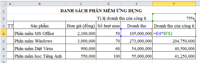 Vận dụng trang 26 Tin học 8: Em hãy truy cập vào một số chợ ứng dụng để tìm thông tin về năm phần mềm ứng dụng mà em quan tâm (đơn giá, số lượt mua,…) và tạo bảng tính lưu lại các thông tin đó theo mẫu như ở Hình 5.5. Hãy lập công thức để tính Doanh thu và Doanh thu của công ti sản xuất phần mềm cho năm phần mềm ứng dụng đó (giả sử số tiền mà công ti sản xuất phần mềm nhận được là 75% Doanh thu)