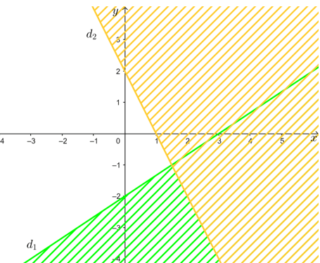 Miền nghiệm của hệ bất phương trình là phần không gạch sọc ở hình trên không kể đường thẳng d1 và d2.