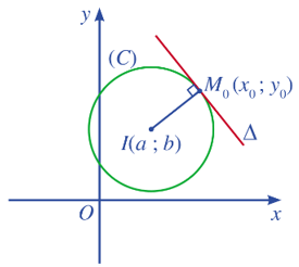 Cho đường tròn (C) tâm I(a ; b) và điểm M0(x0 ; y0) nằm trên đường tròn đó. Gọi ∆ là tiếp tuyến của đường tròn (C) tại điểm M0(x0 ; y0). Khi đó, ta có: