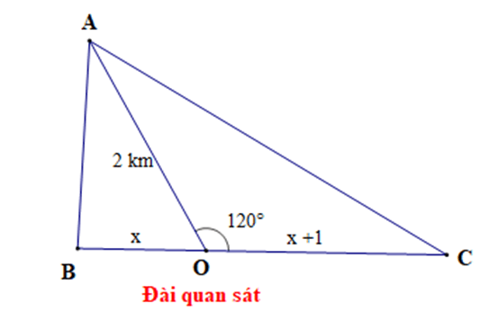 Tính khoảng cách từ đài quan sát O tới B biết khoảng cách từ vị trí A đến vị trí C gấp đôi khoảng cách từ vị trí A đến vị trí B và khoảng cách từ O đến B ngắn hơn khoảng cách từ O đến A.