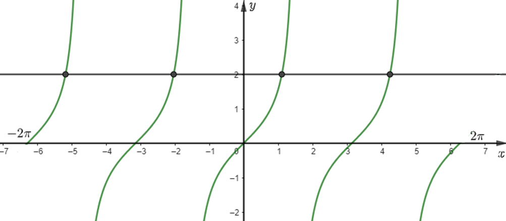 Thực hành 4 trang 32 Toán 11 Tập 1: Có bao nhiêu giá trị x trên đoạn [–2π; 2π] thỏa mãn điều kiện tanx = 2?