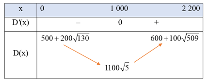 Trên khoảng (0; 2 200), ta thấy D'(x) = 0 khi x = 1 000.