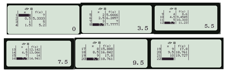 Ấn tiếp phím “=” và nhiều lần phím để màn hình hiển thị bảng giá trị của hàm số trên đoạn [0; 10] như hình dưới đây.