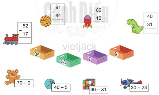 Do đó các thẻ ghi phép tính 80 – 28, 94 – 39, 72 – 13, 71 – 19 em cho vào hộp "Những phép tính có kết quả lớn hơn 50".