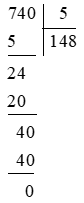 ● 7 chia 5 bằng 1, viết 1 1 nhân 5 bằng 5, 7 trừ 5 bằng 2 ● Hạ 4, 24 chia 5 bằng 4, viết 4 4 nhân 5 bằng 20, 24 trừ 20 bằng 4 ● Hạ 0, 40 chia 5 bằng 8, viết 8 8 nhân 5 bằng 40, 40 trừ 40 bằng 0 Vậy 740 : 5 = 148 |