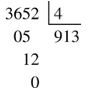 + 36 chia 4 bằng 9, viết 9 9 nhân 4 bằng 36, 36 trừ 36 bằng 0 + Hạ 5, 5 chia 4 được 1, viết 1 1 nhân 4 bằng 4, 5 trừ 4 bằng 1 + Hạ 2, 12 chia 4 được 3, viết 3 3 nhân 4 bằng 12, 12 trừ 12 bằng 0 Vậy 3 652 : 4 = 913 |