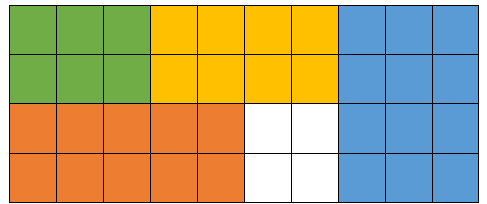 Bài 4. Bác Hùng trồng hoa trên một khu đất. Khu đất của bác được chia thành 40 phần bằng nhau và bác phân bố trồng hoa như hình vẽ dưới đây. Em hãy viết phân số chỉ phần đất trồng mỗi loại hoa trên khu đất.