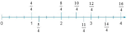 d) Tìm phân số thích hợp tương ứng với mỗi vạch trên tia số: