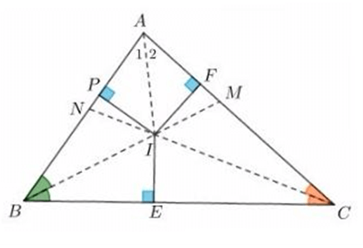 Ví dụ: Trong hình vẽ dưới đây có các đường phân giác góc A, B, C cùng đi qua điểm I. Và điểm I cách đều ba cạnh AB, AC, BC suy ra IP = IF = IE.