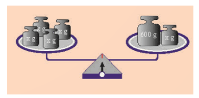 Khi cân thăng bằng, ta có thể tìm được khối lượng quả cân bằng cách cho tổng khối lượng các quả cân ở hai bên bằng nhau, sau đó tìm giá trị của x.