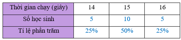 Biểu đồ hình quạt tròn biểu diễn thời gian chạy 100 m (tính theo giây) của 20 học sinh nam: