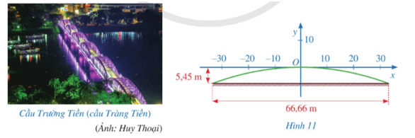 Giả sử một nhịp dầm thép có dạng parabol y = ax2 trong hệ trục toạ độ Oxy, ở đó Ox song song với mặt cầu. Biết rằng, hai chân nhịp dầm thép trên mặt cầu cách nhau 66,66 m, khoảng cách từ đỉnh cao nhất của nhịp dầm thép đến mặt cầu là 5,45 m (Hình 11).