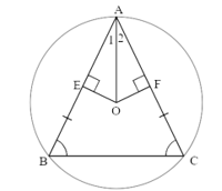 Bài 3. Cho ∆ABC cân tại A nội tiếp đường tròn (O). Gọi E, F theo thứ tự là hình chiếu của (O) lên AB và AC. Chứng minh rằng AO là tia phân giác của .