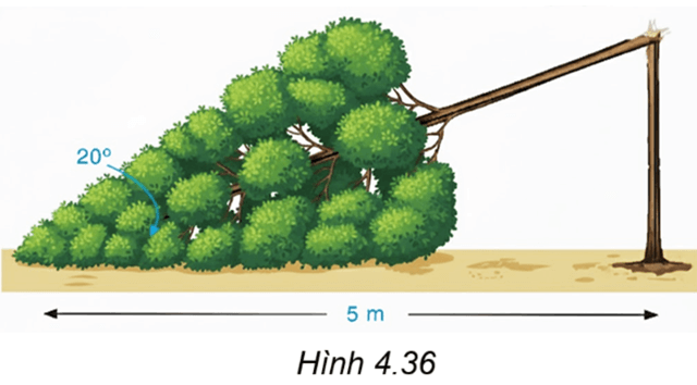 Bài 4.28 trang 82 Toán 9 Tập 1: Một cây cao bị gãy, ngọn cây đổ xuống mặt đất. Ba điểm: gốc cây, điểm gãy, ngọn cây tạo thành một tam giác vuông. Đoạn cây gãy tạo với mặt đất góc 20° và chắn ngang lối đi một đoạn 5 m (H.4.36). Hỏi trước khi bị gãy, cây cao khoảng bao nhiêu mét (làm tròn kết quả đến hàng phần mười)?