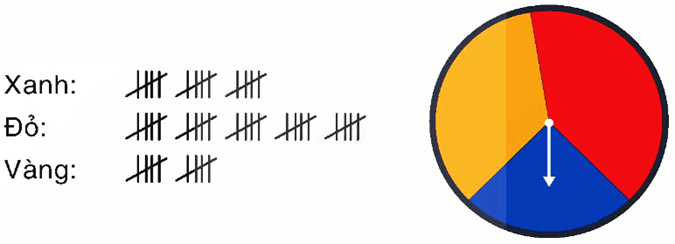 Luyện tập 1 trang 39 Toán 9 Tập 2: Quay 50 lần một tấm bìa hình tròn được chia thành ba hình quạt với các màu xanh, đỏ, vàng. Quan sát và ghi lại mũi tên chỉ vào hình quạt có màu nào khi tấm bìa dừng lại. Kết quả thu được như sau: