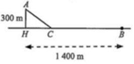 Ví dụ 2: Một người đi bộ xuất phát từ B trên một bờ sông coi là đường thẳng với vận tốc 6 km/h để gặp một người chèo thuyền xuất phát cùng lúc từ vị trí A với vận tốc là 3 km/h. Nếu người chèo thuyền di chuyển theo đường vuông góc với bờ thì phải đi một khoảng cách AH = 300m và gặp người đi bộ tại địa điểm cách B một khoảng BH = 1400m. Tuy nhiên, nếu di chuyển theo cách đó thì hai người không tới cùng lúc. Để hai người đến cùng lúc thì mỗi người cùng di chuyển về vị trí C như hình sau.