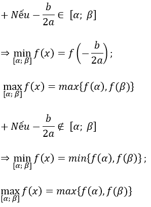 Dựa vào đồ thị (bảng biến thiên) của hàm số y = ax2 + bx + c, a ≠ 0 ta thấy nó đạt giá trị lớn nhất, nhỏ nhất trên [α; β] tại điểm x = α hoặc x = β hoặc x = -b/(2a). Cụ thể: