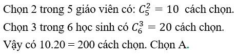 Bài 5: Một hội đồng gồm 2 giáo viên và 3 học sinh được chọn từ một nhóm 5 giáo viên và 6 học sinh. Hỏi có bao nhiêu cách chọn?