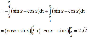 Ví dụ 5. Diện tích hình phẳng giới hạn bởi y = sinx, y = cosx, x = 0; x = π là: