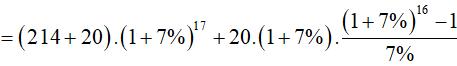 A = (214+20).(1+7%)17 + 20.(1+7%).(1+(1+7%)+(1+7%)2+...+(1+7%)15 )