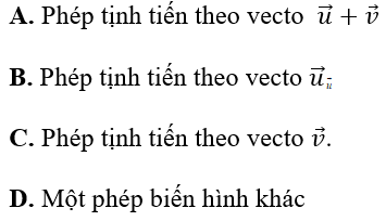 Bài 4: Trong không gian cho hai vecto u→ và v→. Với M là điểm bất kỳ, ta gọi M1 là ảnh của M qua phép Tu→ và M2 là ảnh của M1 qua phép Tv→. Khi đó phép biến hình biến điểm M thành đểm M2 là: