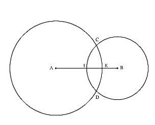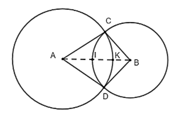 Câu 2: Trên hình sau đây, ta có hai đường tròn (A; 3cm) và (B; 2cm) cắt nhau tại C, D, AB = 4cm . Đường tròn tâm A, B lần lượt cắt đoạn thẳng AB tại K, I.
