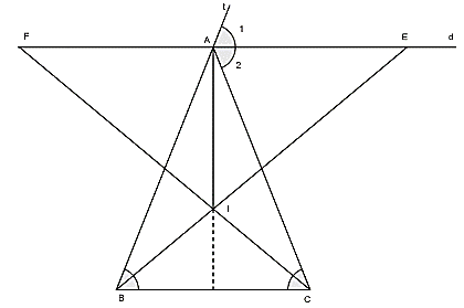 Bài 2:Cho tam giác ABC cân tại A. Qua A kẻ đường thẳng d song song với đáy BC. Các đường phân giác của góc B và góc C lần lượt cắt d tại E và F. Chứng minh rằng: