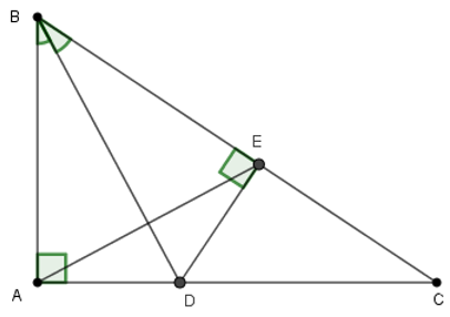 Câu 19: Cho tam giác ABC vuông tại A, có . Tia phân giác của góc B cắt AC tại D. Kẻ DE vuông góc với BC tại E