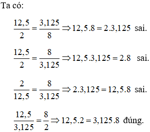Câu 6. Cho đẳng thức 12,5 . 2 = 3,125 . 8. Ta suy ra được tỉ lệ thức: