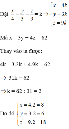 Ví dụ 2: Tìm x, y , z biết và x – 3y + 4z = 62