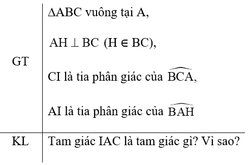 Ví dụ 2. Cho tam giác vuông tại A, kẻ AH vuông góc với BC (H ∈ BC). Các tia phân giác góc C và cắt nhau tại I. Tam giác IAC là tam giác gì? Vì sao?