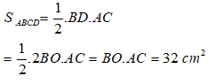 Do đó SABCD = 1/2.BD.AC = 1/2.4√ (21) .8 = 16√ 21 ( cm2 )